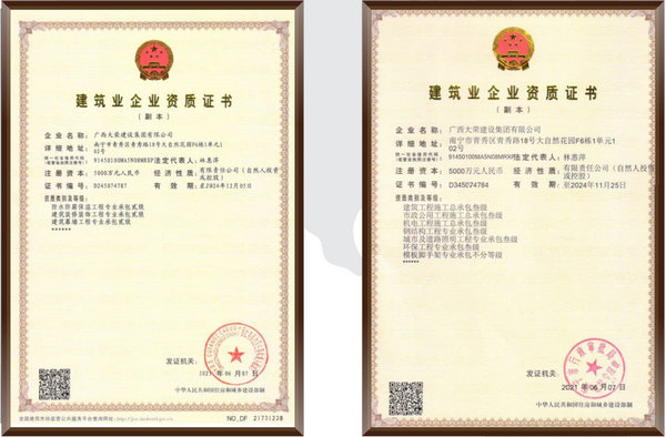 广西大荣建设集团有限公司为国家房屋建筑工程、市政公用工程、机电工程、钢结构工程、城市及道路照明工程、环保工程、建筑装 修装饰工程、建筑幕墙工程三级资质。 公司拥有各类专业技术人员100多人,其中中高级职称30多人,一二级建造师20多人,现已形成了质量、安全、环境“三位一体”管理 体系,并获得多个广西优质工程奖项。 走进新时代,面对新形势,公司将继续恪守“诚信为本合作共赢”的经营方针,秉承“创新奉献”的企业精神,立足于新要求、新工艺、新 装备、新模式,为祖国建筑业的发展和现代化建设贡献更大力量!